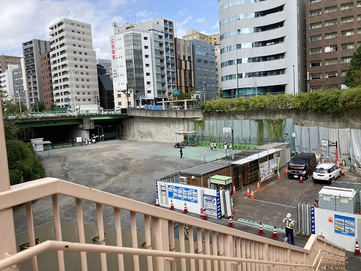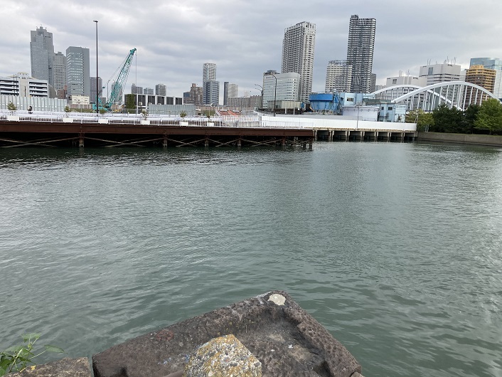 園内から対岸を眺めますと、旧築地市場の建物は跡形もなくなり、更地となった敷地は長い綱板で囲まれています。綱板の外側の通路には自転車に乗った一般の人も見かけます。通路の先はどこに繋がっているのでしょうか?