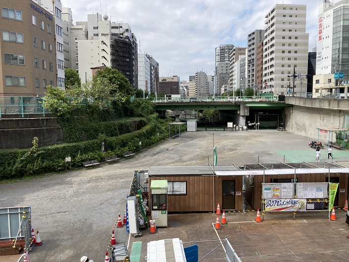 築地川公園から先の本流の流路は、入船橋交差点のところで北方向から北西方向に向きを変えます。築地川は完全に埋立てられたのですが、地表まで埋立てられた区間と、川の形を残して川底を道路、もしくは公園にした半地下区間の両方の形態があります。