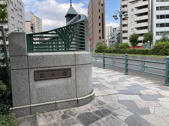 当初、築地川本流はこの角地に沿って流れていましたが、昭和初期に楓川・築地川連絡運河が堀割されました。それで、見かけ上3つの川がこの角地で合流しているかのようななりました。それをつなぐものとして架けられたのが三吉橋です。3本(実際は築地川と楓川の2本)の流れに架かる橋ですので、上空から見れば分かると思いますが三股のような格好になっています。