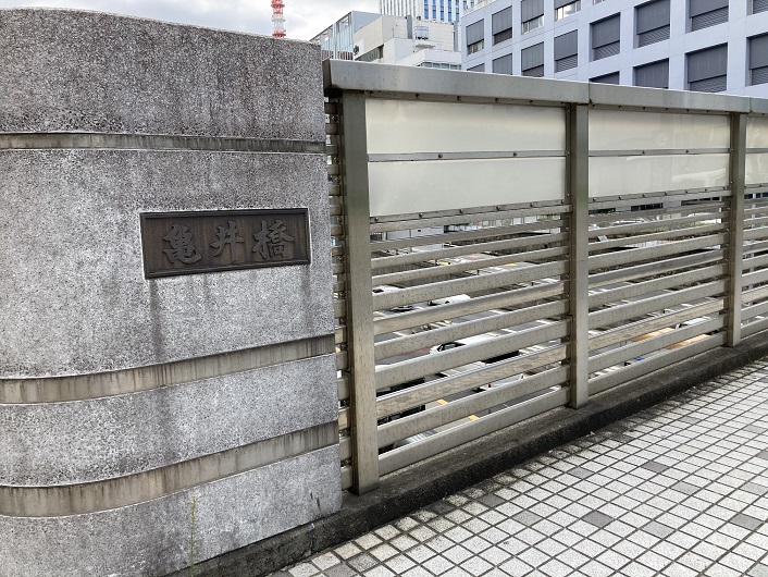震災復興橋梁のひとつです。築地川本流に新架された橋長31.5メートル、幅15メートルの鈑桁橋で、昭和2年(1927年)3月に竣工しました。京橋区築地二丁目(現在の三丁目)から明石町聖路加病院わきに渡されていました。戦後、首都高速道路の建設のために築地川が埋立てられ、橋は昭和60年に撤去されました。