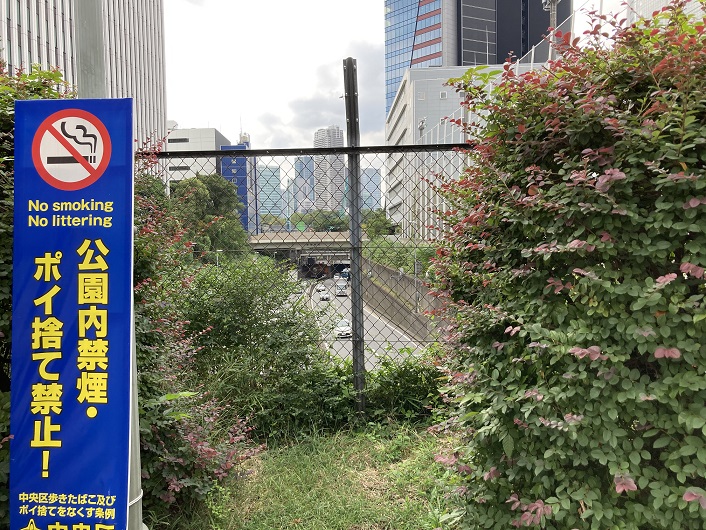 三吉橋から先は首都高都心環状線の専用道路となっています。川底が半地下の道路になっているので、車は眼下に見えることになります。ほとんどは開渠になっていますが、道路の上に蓋をしてその上に土を造成して公園にしているところもあります。亀井橋手前には、築地川亀井橋公園があります。