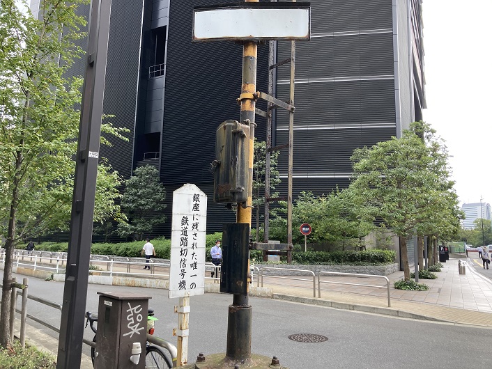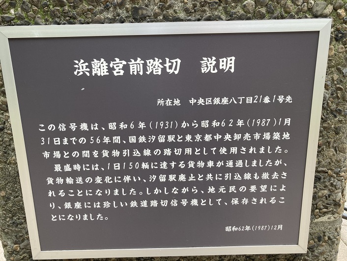 この信号機は、昭和6年(1931年)から昭和62年(1987年)1月31日までの56年間、国鉄汐留駅と東京都中央卸売市場築地市場との間を貨物引込線の踏切用として使用されました。最盛時には、1日150輌に達する貨物車が通過しましたが、貨物輸送の変化に伴い、汐留駅廃止と共に引込線も撤去されることになりました。しかしながら、地元民の要望により、銀座には珍しい鉄道踏切信号機として、保存されることになりました。