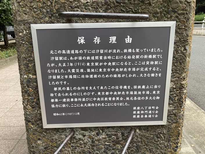 元この高速道路の下には汐留川が流れ、鉄橋も架っていました。汐留駅は、わが国の鉄道開業当時における始発駅の新橋駅でしたが、大正3年(1914年)東京駅が中央駅になると、ここは貨物駅になりました。大震災後、築地に東京市中央卸売市場が完成すると、汐留駅と市場間に荷物運搬のための線路がしかれ、大きな働きをしたのです。都民の暮しの台所を支えて来たこの信号機を、国鉄廃止に当り捨て去られるのにしのびず、東京都中央卸売市場築地市場、東京都第一建設事務所並びに中央区教育委員会、地元各位の多大な御協力に依り、ここに永久保存されることになりました。