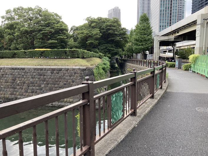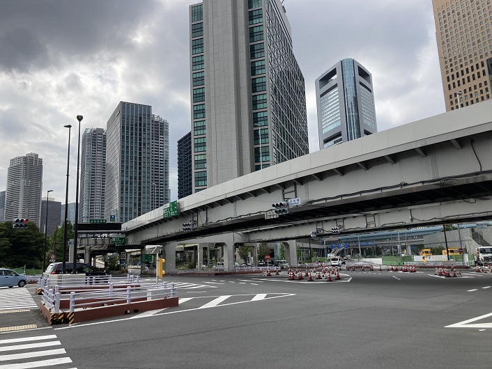 首都高都心環状線は汐先橋手前から右にカーブし、海岸通りに沿って高架になります。築地川本流の流路はそのまま真っ直ぐに進み、浜離宮庭園の入口である大手門橋付近に流れ出します(流れ出していました)。