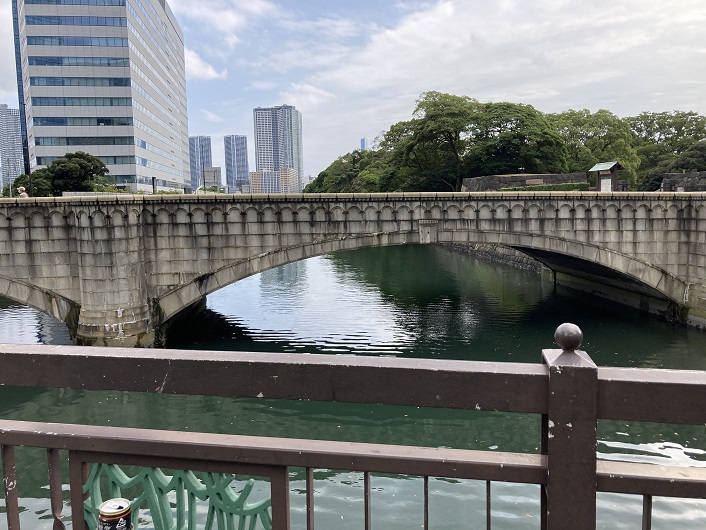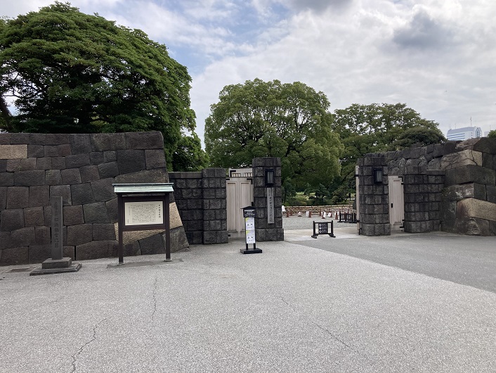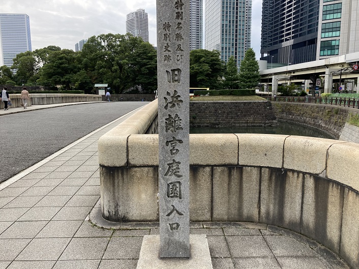 私は知らなかったのですが、旧築地市場が解体された跡に環状2号線の暫定道路に沿って歩行者用の通路が新設されたみたいなんです。歩いていないので分かりませんが、そちらを通っても築地川の河口にはたどり着けそうです。ただ、折角なので浜離宮庭園に入場して、その突端から築地川河口を眺めて見たいと思います。大手門橋を渡って正門から入場します。まるでお城の中に入るみたいです。
