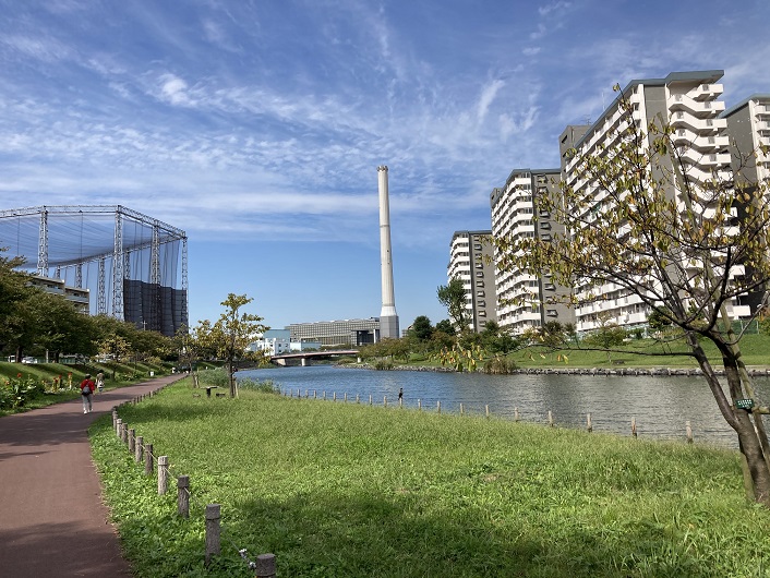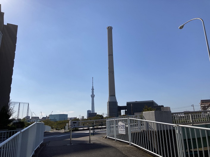 ゆりの木橋の袂から眺めると、墨田清掃工場の煙突とスカイツリーが並んで見えます。ここは墨田区名物競演の絶景スポットですね。