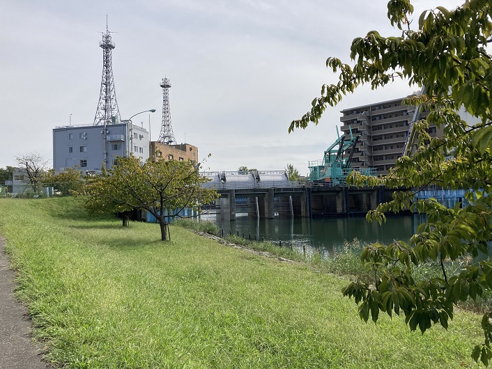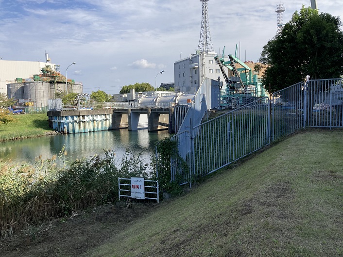 旧中川の上流端である木下川排水機場にやってきました。普通の河川は、分流する河川から直接水路を設けているのですが、旧中川では荒川と水位差があるので、排水機場を介して間接的に繋がっています。