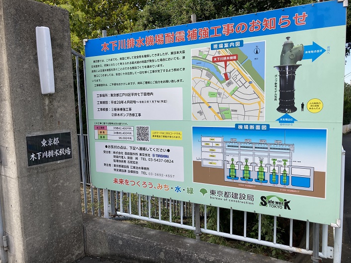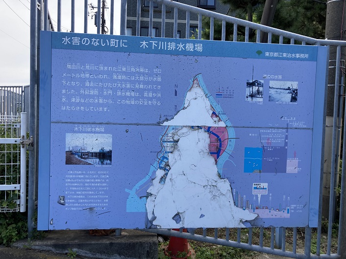 排水機場の入口ゲート横に2枚の大きな案内板がありました。この施設は水害防止のために造られたのですね。ここで疑問に思ったのですが、排水機場に木下川という名称が付けられています。地図を見たのですが、この辺りにそれらしき川は見当たりません。既に埋め立てられ、名前だけ残っているのかなと思ったのですが、どうも違うようです。「川」というのは当て字で実際は別の意味らしいです。深くは詮索しませんが。