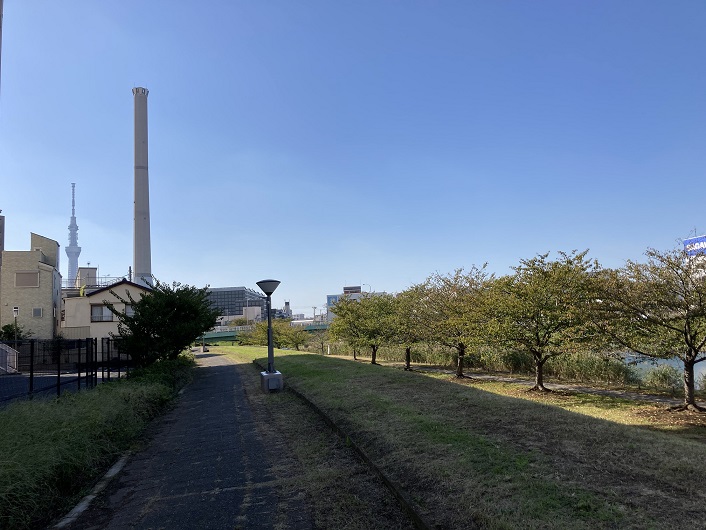 河川敷は水辺公園になっていて、遊歩道も鋪装され、とても歩きやすくなっています。正面には墨田清掃工場の特徴的な煙突が聳えています。東京スカイツリーが建設されるまでは、荒川に近い墨田区のランドマークといえばこの煙突でした。目立つのも当然で、高さは150mもあります。遠くから眺めると、ロケットが発射台に据え付けられているように見えます。