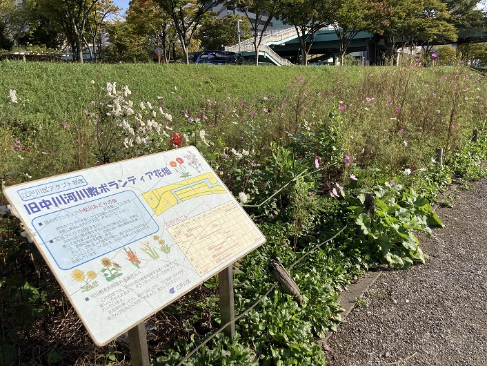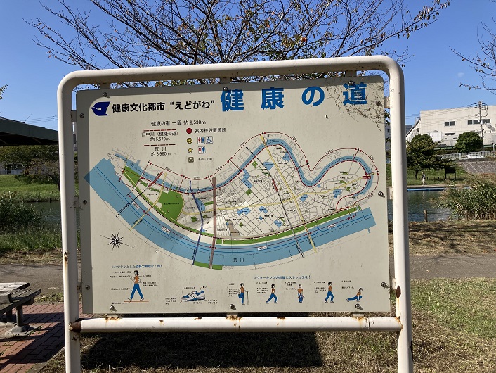 河川敷に降りますと、案内板が立っていました。旧中川の左岸は全て江戸川区に属しているんですね。江戸川区健康の道には、お散歩コースだけでなくサイクリングコースも豊富に登録されていますので、どれを選んでも面白そうです。