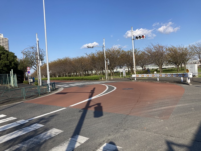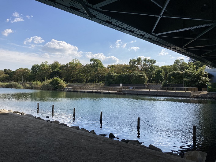 首都高7号小松川線を越えた先から、旧中川沿いに大島小松川公園が広がっています。ここに架かる橋には、もみじ大橋とかさくら大橋とかの名前が付けられています。情緒があっていいですね。旧中川は、ボートの練習場にもなっています。流れがないので波がなく、ボートを漕ぐのにも適しているのでしょう。