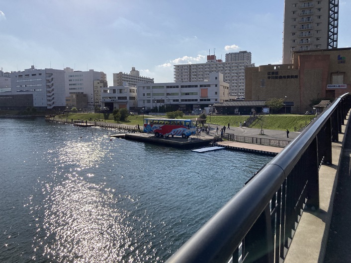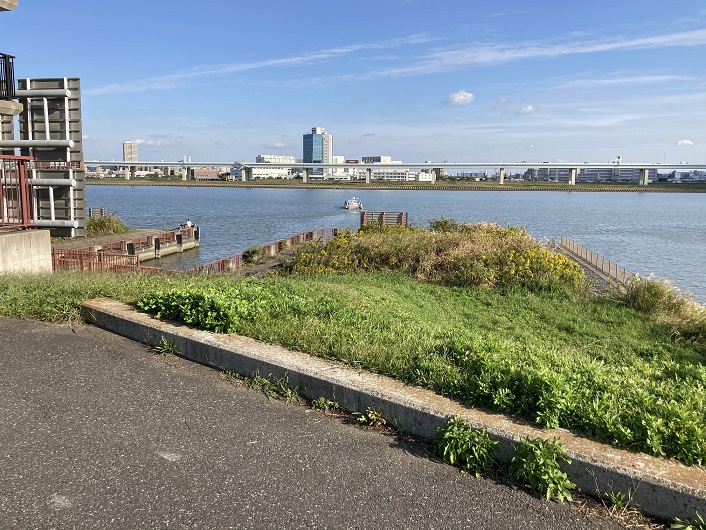 対岸の河川敷に船着き場らしき施設があります。但し、この船着き場には川から上がるためのステップが附属しています。普通の船舶を横づける桟橋ではなく、スカイツリー前で見たスカイダックの上陸と進水のための施設のようです。旧中川は波のない湖のようなものですので、スカイダックの水走行には最適ですね。