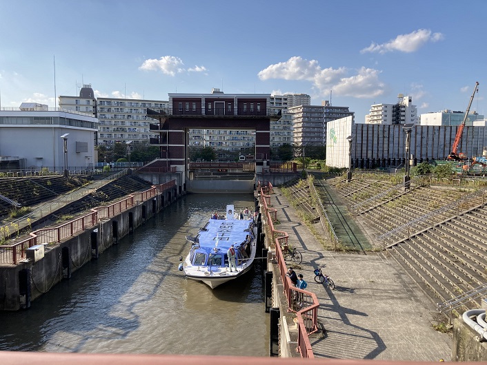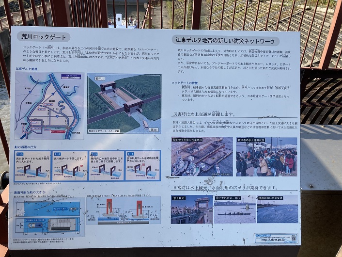 ロックゲート(=閘門)は、水位の異なる二つの河川を繋ぐための施設で、船が乗る「エレベーター」のような役目を果たします。荒川と旧中川は「水位差が最大で約3.1m」にもなりますが、荒川ロックゲートが完成する事により結ばれ、荒川と隅田川にはさまれた“江東デルタ地帯”への水上交通が両方向から確保できるようになりました。