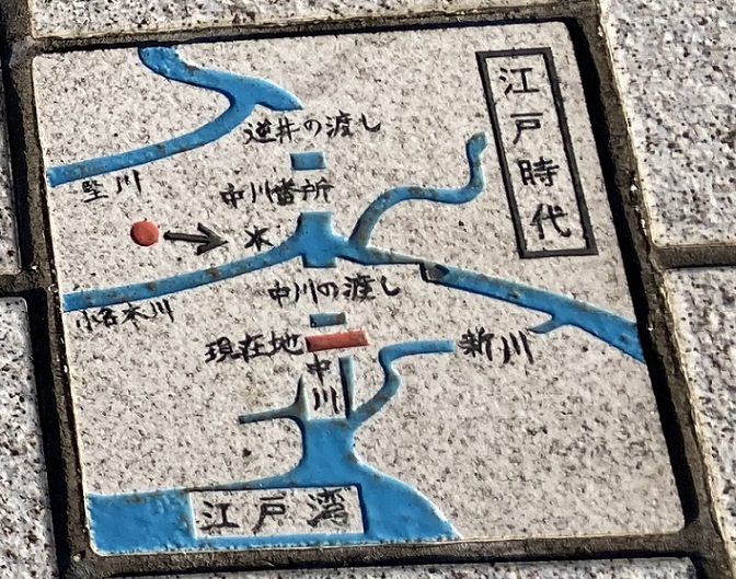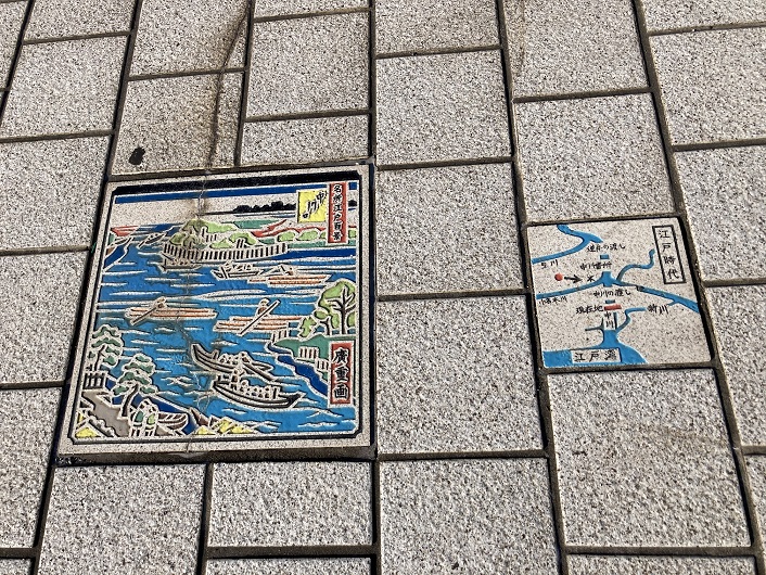 歩道には、江戸時代の水路図がタイルに描かれて埋め込んでありました。今度は新川を歩かないと。