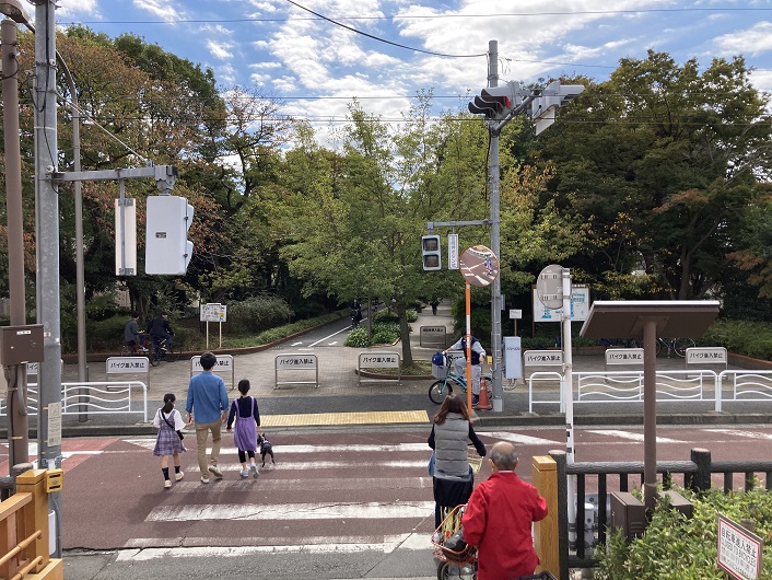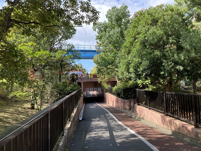 公園は東西に一直線に延びていますので、途中で南北方向の主要道と交差します。遊歩道は道路の下をトンネルで抜けられますので、いちいち道路面まで上がる必要はありません。