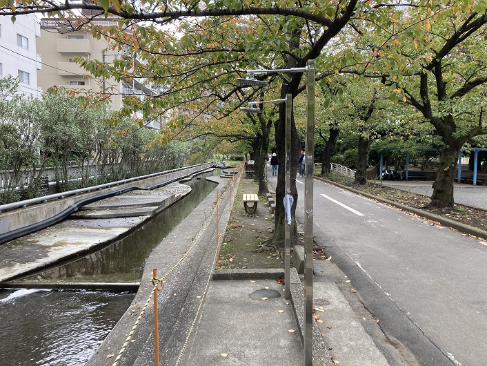 公園に入りますと、遊歩道とその脇を流れる水路が真っ直ぐに延びています。水路は川というより、人工的に水を流している感じです。