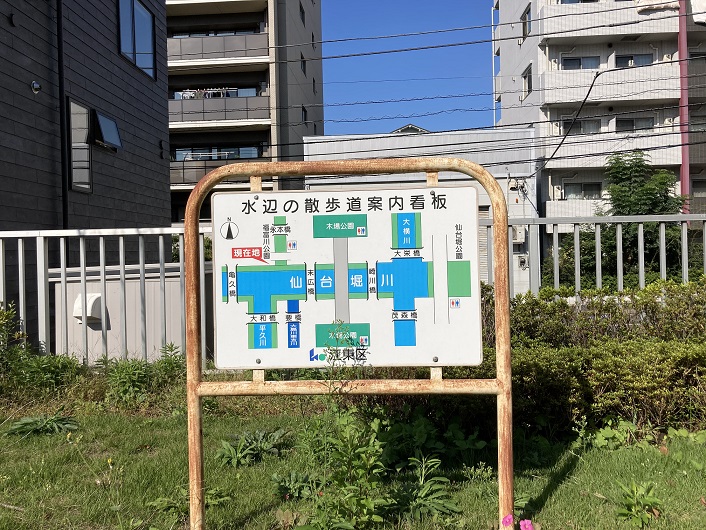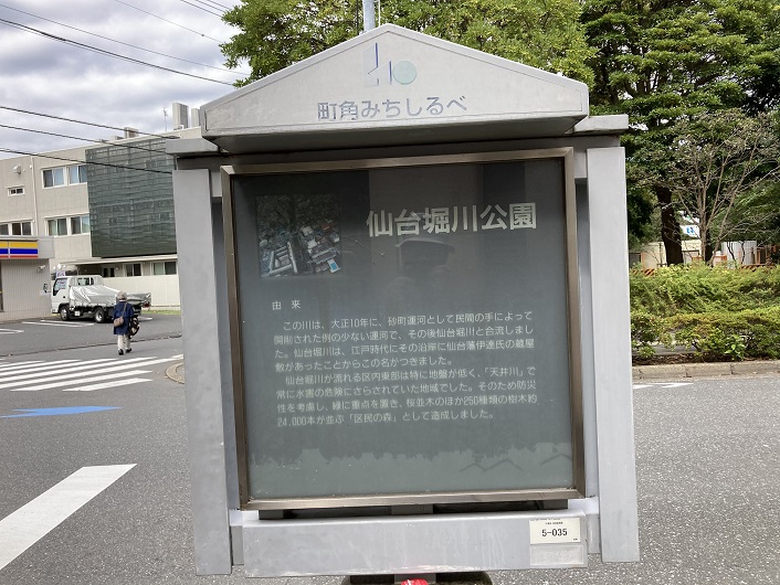 遊歩道の脇に仙台堀川公園の案内板が立っていました。