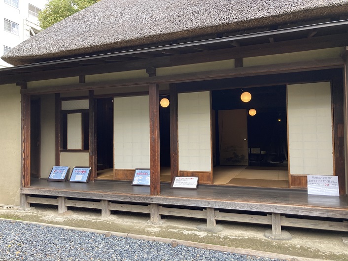 公園がL字型に直角に曲がる手前に古民家が保存されていました。今時、都会で茅葺きの屋根を維持するのは大変なことだと思います。それにしても、綺麗に葺いてありますね。