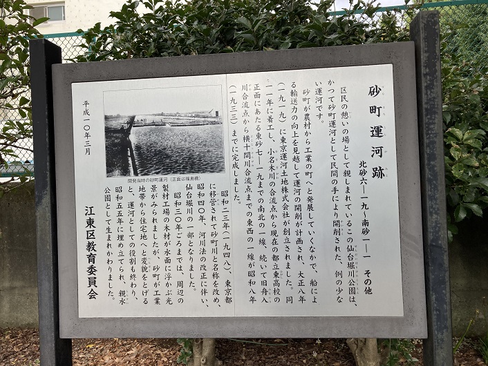 公園がL字型に直角に曲がる角の広場に砂町運河の案内板が立っていました。