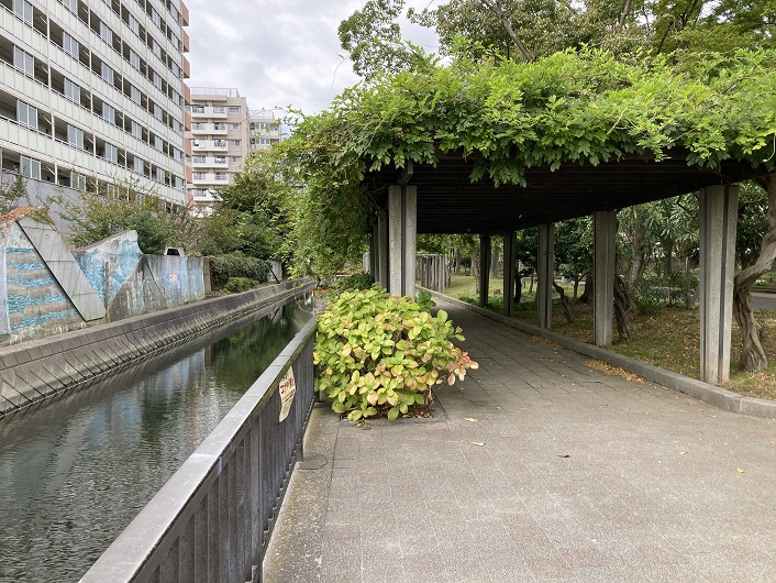 直角に折れた後、遊歩道は真っ直ぐ西に向って延びています。水路にはかなりまとまった量の水が流れています。というか、溜まっています。遊歩道の上に造られているのは藤棚でしょうか?