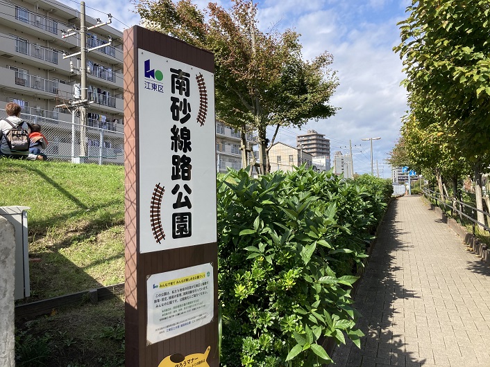 地表に上がると、線路脇には南砂線路公園があります。特に遊具とかは見当たりませんでしたが。