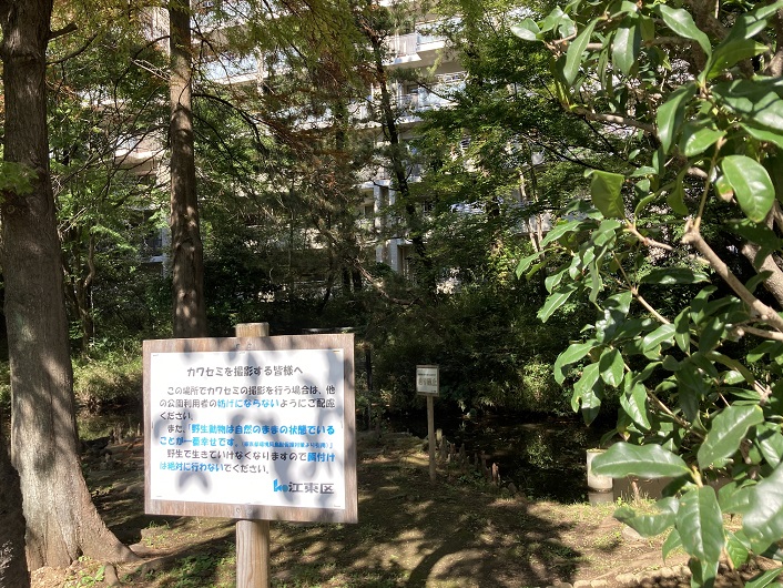 この場所でカワセミの撮影を行う場合は、他の公園利用者の妨げにならないようにご配慮ください。また、「野生動物は自然のままの状態でいることが一番幸せです(東京都環境局鳥獣保護対策より引用)。野生で生きていけなくなりますので餌付けは絶対に行わないでください。