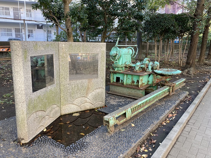 かつて、横十間川と仙台掘川が交差する地点の東側に尾高水門という小さな水門がありました。その水門を動かしていた駆動部分が仙台掘川公園の一角に残されています。この水門はマイターゲート式水門と呼ばれ、扉をドアのように回転させて開閉させるもので、川の上に上屋を必要としないため、運河などで利用された方式です。観音開きであるために、川としての連続性を損なわれないないことも小河川には合った方式だったと思われます。ちなみに、片開きの場合はスイングゲートで、両開きの場合はマイターゲートといいます。