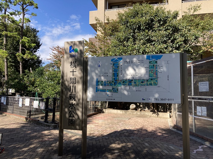 ということで、先日小名木川を歩いた際に通りかかった塩の道橋から仙台掘川親水公園に入ります。公園の入口に公園全体の案内図が立っていました。L字を横に寝かせたような形をしていますね。中間点の西側に、同じくL字を横にした形の横十間川親水公園が交差しています。