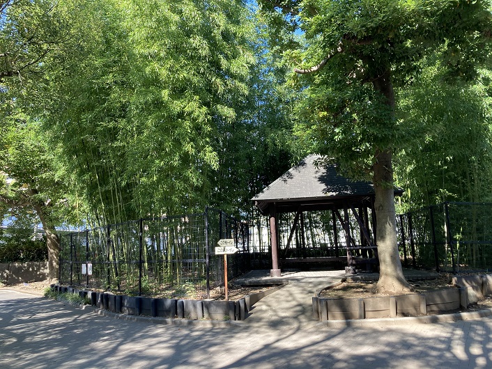 両川の交差地点の脇には東屋風の休息所があります。周りは竹林で囲まれています。筍が採れそうです。