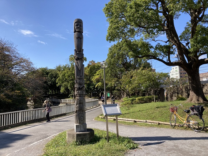 トーテム・ポールは、カナダ北西岸に住む原住民がトーテム崇拝の対象としてきたもので、その造形は、芸術的にも高く評価されています。ここに立てられたトーテム・ポールは、カナダのブリティッシュ・コロンビア州林産審議会から江東区との友好親善と両国の木材産業発展のシンボルとして、1984年4月にカナディアン・シーダークラブを通じて本区に寄贈された3本のうちの1本で、他の2本は新木場駅前、舟木橋児童遊園に立てられています。