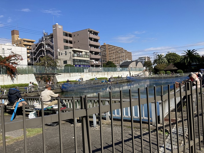 豊住橋の先に豊住魚釣場があります。江東区が運営している無料の釣り堀で、ヘラブナや鯉が放流されています。釣り竿や餌など釣り具のレンタルや販売はしていないので、すべて自分で用意して持参する必要があるものの、利用料金が無料なので連日多くの釣り好き区民で賑わっています。釣り竿は1人1本まで、長さは13尺(3.9m)以内、リール・吸い込み針・ギャング針は使用不可、返しのない釣り針(スレ針)を利用すること等の決まりがあります。釣った魚はキャッチアンドリリースとなっています。釣り堀にはトイレがあり、周辺には飲食店やコンビニもあるので、1日ゆったりとヘラブナ釣りをのんびりと楽しむ休日にぴったりです。この日もヒマなおじさん達で賑わっていました。