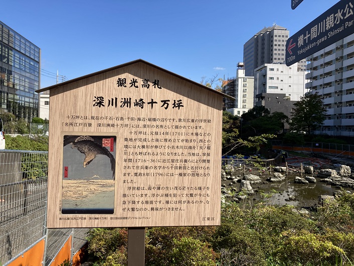 十万坪とは、現在の千石・石島・千田・海辺・扇橋の辺りです。歌川広重の浮世絵「名所江戸百景 深川洲崎十万坪」には、深川の名所として描かれています。十万坪は、元禄14年(1701年)に木場などの築地が完成した後に埋め立てが始まり、西との境には大横川が伸びて小名木川以南を「亥ノ堀川」とも呼ばれるようになりました。当地は、享保年間(1716年〜1736年)に近江屋庄兵衛らにより開墾されて庄兵衛の名字から千田新田と名付けられます。寛政8年(1796年)には一橋家の抱地となりました。浮世絵は、葭や薄の生い茂る茫々たる様子を描いています。浮かぶ桶を狙って大鷲が今にも急下降する場面です。桶には何があるのか、なぜ大鷲なのか、興味がつきません。