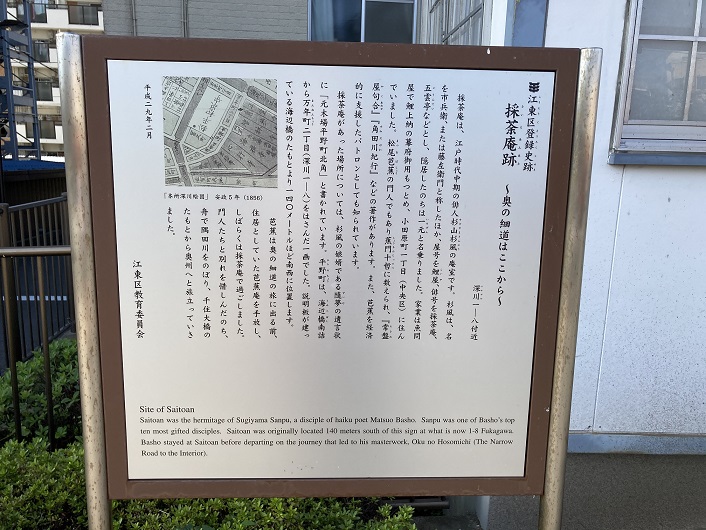 採茶庵は、江戸時代中期の俳人杉山杉風の庵室です。杉風は名を市兵衛、または藤左衛門と称したほか、屋号を鯉屋、俳号を採茶庵、五雲亭などとし、隠居したのちは一元と名乗りました。家業は魚問屋で鯉上納の幕府御用もつとめ、小田原町一丁目(中央区)に住んでいました。松尾芭蕉の門人でもあり蕉門十哲に数えられ、「『常盤屋句合」・「角田川紀行」などの著作があります。また、芭蕉を経済的に支援したパトロンとしても知られています。採茶庵があった場所については、杉風の娘婿である隋夢の遺言状に「元木場平野長北角」と書かれています。平野町は海辺橋南詰から万年町二丁目(深川1−8)を挟んだ一角でした。案内板が建っている海辺橋のたもとより140メートルほど南西に位置します。芭蕉は奥の細道の旅に出る前、住居としていた芭蕉庵を手放し、しばらくは採茶庵で過ごしました。門人たちと別れを惜しんだのち、舟で隅田川をのぼり、千住大橋のたもとから奥州へと旅立っていきました。
