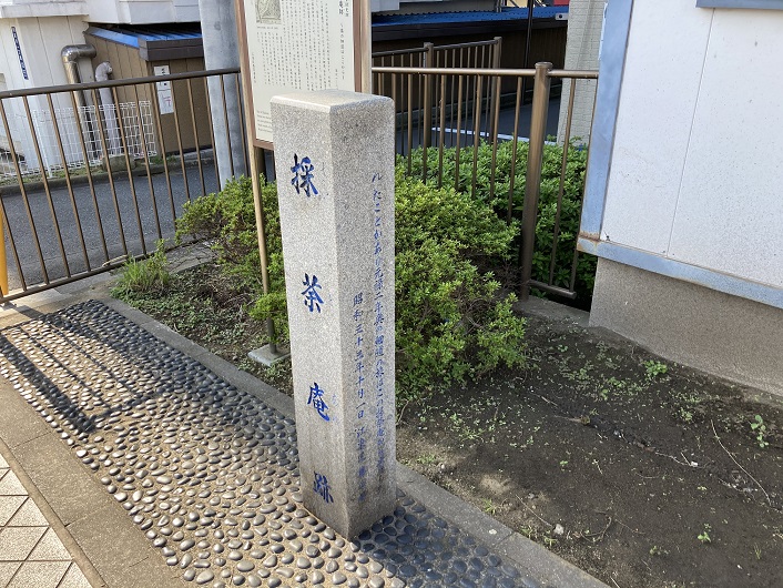 庵の前には、採茶庵跡と書かれた石柱も立っています。左右・後面に説明書きがありました。