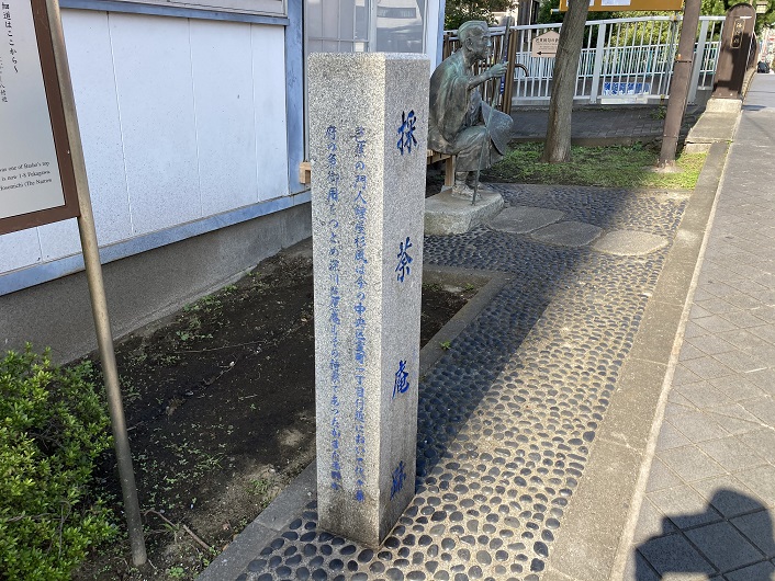 海辺橋の袂の清澄通りに面して採茶庵を復元した小さな建物があり、奥の細道に出立する直前なのでしょうか、その縁台に腰掛けた旅装姿の松尾芭蕉の彫像が置かれています。庵の前には案内板が立っています。