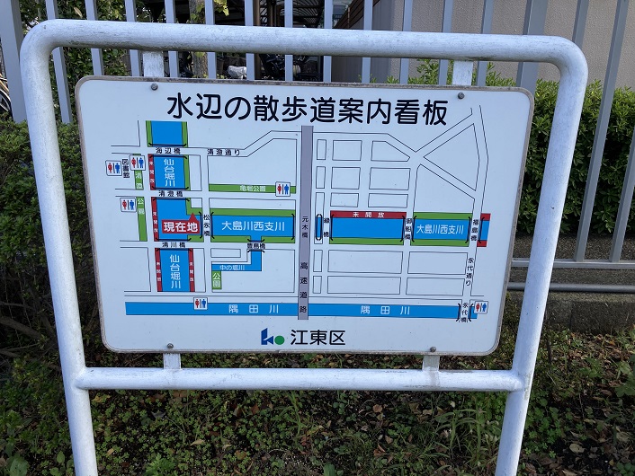 仙台堀川の遊歩道のところどころに橋の名前が記された案内板が立てられていて、距離感が掴めて役立ちます。末広橋の先で仙台堀川から平久川が分流しています。