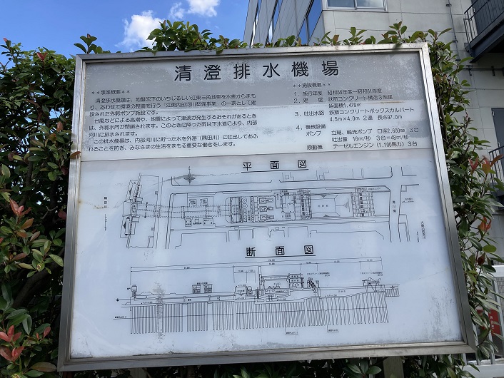 清澄排水機場は、地盤沈下のいちじるしい江東三角地帯を水害からまもり、あわせて環境の整備を行う「江東内部河川整備事業」の一環として建設された外郭ポンプ施設です。台風などによる高潮や、地震によって津波が発生するおそれがあるときは、外郭水門が閉鎖されます。このときに降った雨は下水道により、内部河川に排水されます。この排水機場は、内部河川に貯った水を外海(隅田川)に吐出してあふれることを防ぎ、みなさまの生活をまもる重要な働きをします。