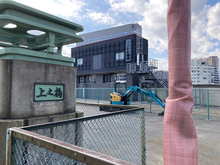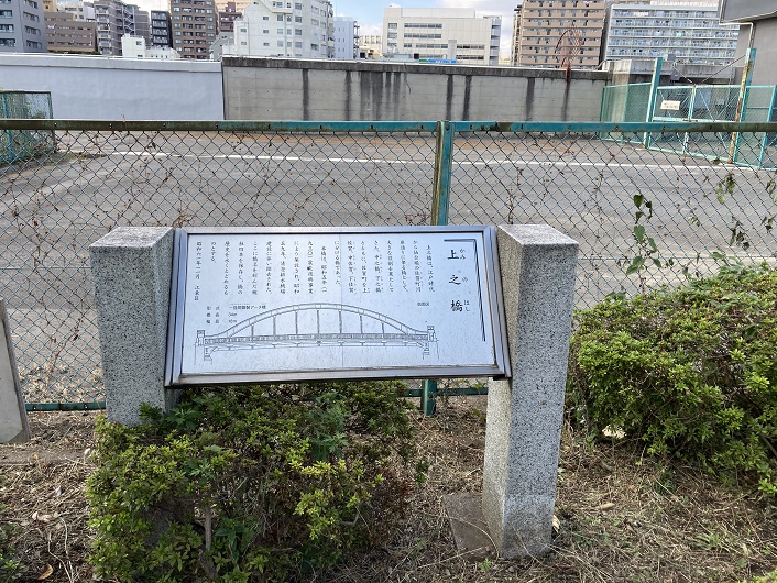上之橋は、江戸時代から仙台堀の佐賀町河岸通りに架る橋として、大きな役割を果たし、中之橋・下之橋とともに佐賀町を上佐賀・中佐賀・下佐賀に分ける橋でした。本橋は、昭和5年(1930年)に震災復興事業により架設され、昭和59年に清澄排水機場建設に伴い撤去されました。ここに橋名を刻んだ親柱四本を保存し、橋の歴史を永くとどめるものとします。