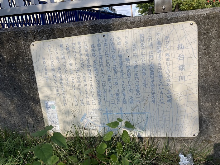 河口間近ですが、仙台堀川の案内板が堤防の壁に貼ってありました。
