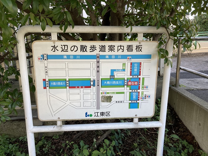 - 中の堀川に引き続いて大島川西支流を歩きます。大島川西支流は清川橋の手前で仙台掘川から分流し、最終的に大島川水門手前で大横川に合流します。大島川は元々は独立した名称でしたが、法律により大横川に一本化され、その支流にのみ大島川の名前が残ったのだそうです。ただ、大横川の隅田川の合流地点には大島川水門の名前が残されていて、かろうじて昔の名残りをとどめています。Wikipediaには記載がありませんが、松永橋近くには私が見逃した大島川西支流の案内板があるそうです。