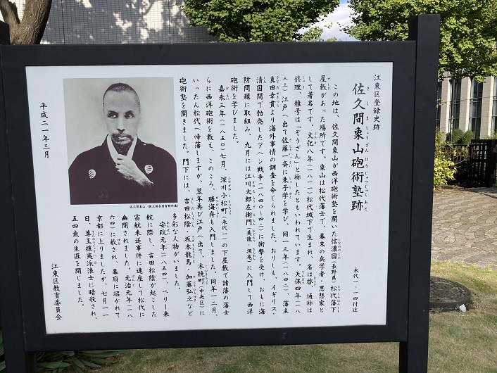 この地は、佐久間象山が西洋砲術塾を開いた信濃国(長野県) 松代藩下屋敷があった場所です。象山は松代藩士で、幕末の兵学者・思想家として著名てす。文化八年(1811年)松代城下で生まれ、名は啓、通称は修理、雅号は「ぞうざん」と称したともいわれています。天保四年(1833年)江戸へ出て佐藤一斉に朱子学を学び、同一三年(1842年)、藩主真田幸貫より海外事情の調査を命じられました。おりしも、イギリス・清国間で勃発したアヘン戦争(1840年〜1842年)に衝撃を受け、おもに海防問題に取組み、九月には江川太郎左衛門(英龍・坦庵)に入門して西洋砲術を学びました。嘉永三年(1850年)七月、深川小松町(永代一)の下屋敷で諸藩の藩士らに西洋砲術を教え、このころ、勝海舟も入門しました。同年一二月、いったん松代へ帰藩しますが、翌年再び江戸へ出て、木挽町(中央区)に砲術塾を開きました。門下には、吉田松陰・坂本龍馬・加藤弘之など多彩な人物がいました。安政元年(1854年)、ペリー来航に際し、吉田松陰が起こした密航未遂事件に連座して松代に幽閉されました。元治元年(1864年)に赦され、幕府に招かれて京都に上りましたが、七月十一日、尊王攘夷派浪士に暗殺され、五四歳の生涯を閉じました。