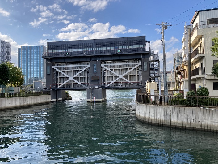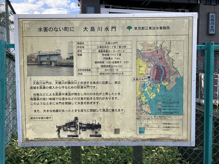 大島川水門は、大横川が隅田川と合流する地点に位置し、周辺流域を高潮の侵入から守るための防潮水門です。台風などによる高潮や津波が発生し河川の水位が上昇したとき、地盤高の低い地域では浸水などの災害が起きる恐れがあります。このようなときに水門を閉鎖して水害を防ぎます。また、大きな地震があったときも直ちに閉鎖して津波に備えます。