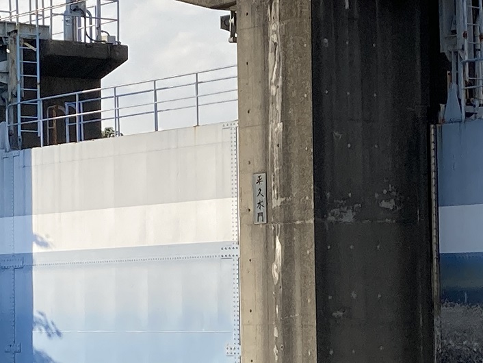 汐浜運河との合流点に設置されているのが平久水門です。水門名のプレートがやけに小さいですね。