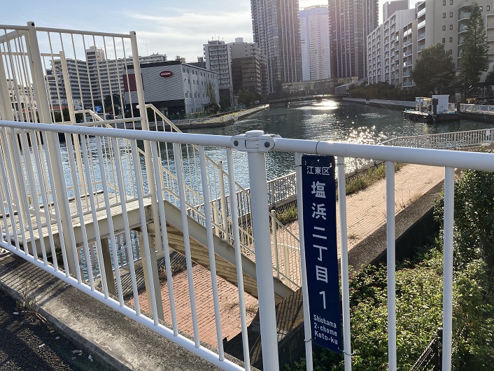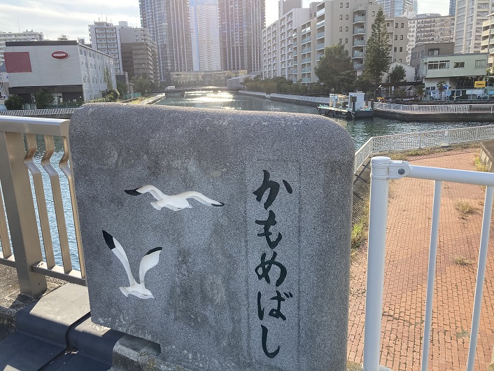 平久水門から真っすぐに延びた水路は汐見運河と合流します。汐見運河には鴎(かもめ)橋が架かっています。この橋名は何とか読めますね。汐見運河から先にも豊洲運河とか辰巳運河とか東雲(しののめ)運河があり、お互い混じり合っているのでどこがどこなのか区別がつきません。やはり平久水門を平久川の終点とするのが妥当でしょう。