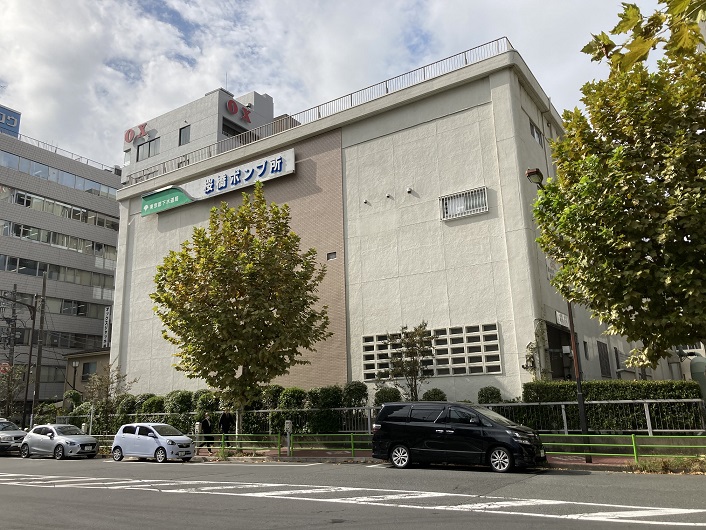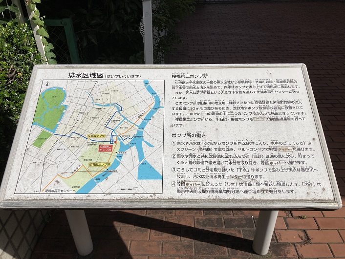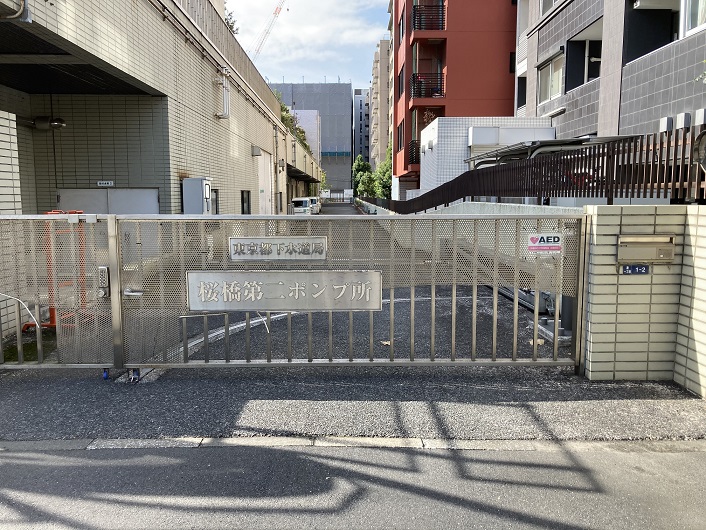 桜橋第二ポンプ所は下水処理のための施設です。旧河川の跡地は高速道路になるか、下水管を通すか、緑道になるか、あるいはビル街になるか、使われ方はいろいろですね。