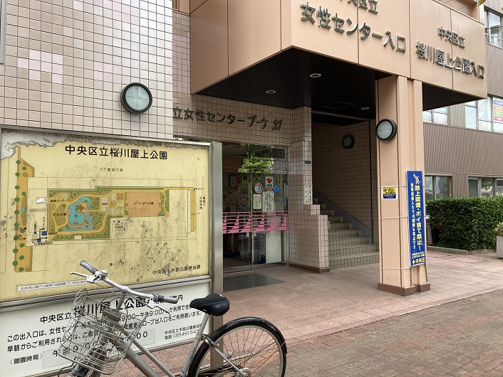 桜川公園を出たところが桜橋第二ポンプ所の裏手にあたります。細長い建物には女性センターも設置され、屋上には桜川屋上公園も造られています。