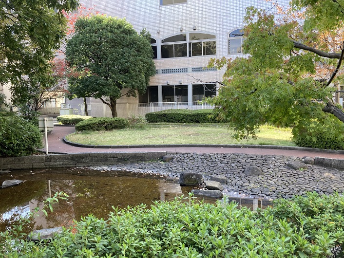 ゲートボール場の奥には庭園が造られ、池も設けられています。水路に水は流れていませんでしたが、桜川の跡地としてふさわしい施設ですね。