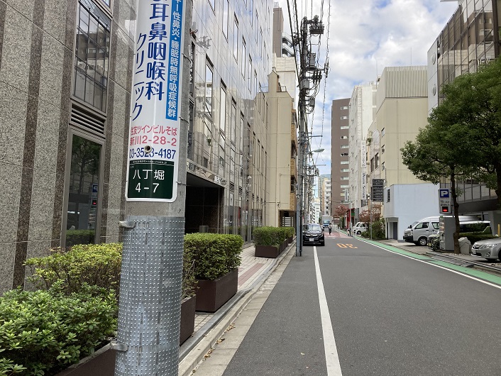 桜橋ポンプ場から新大橋通りまでは、桜川跡地にビルが立ち並んでいます。地名の八丁掘に開削当初の名残りが感じられます。