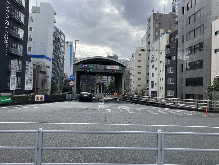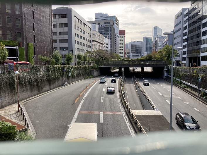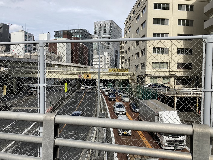 楓川・築地川連絡運河は築地川と合流し、川筋の変わった築地川と一本になって南の方向に繋がって延びていきます。半地下になった運河跡の底には首都高が通っています。片側2車線でも余裕のある幅ですから、如何に運河が大きかったかが想像できます。