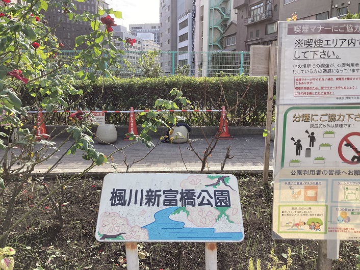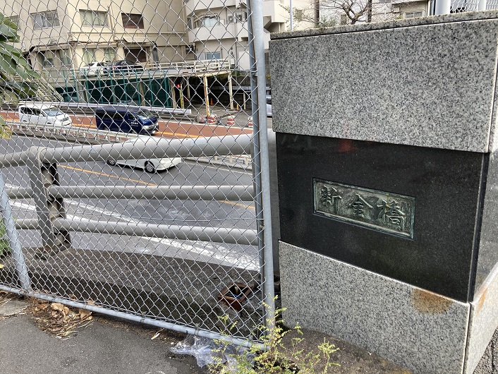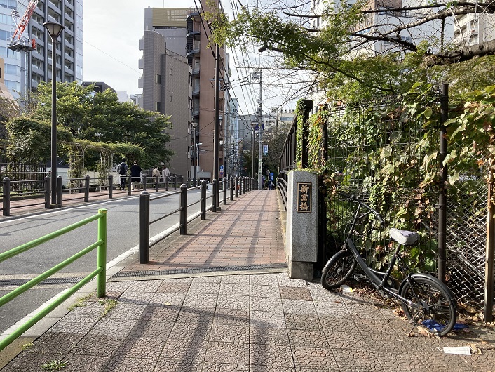 楓川・築地川連絡運河に架けられていた橋は、新金橋・新富橋・三吉橋の三つです。新金橋は始点、三吉橋は終点ですから、間には新富橋があるだけです。新富橋には小さな公園が併設されています。その名前は「楓川新富橋公園」となっています。この区間も楓川の一部とされているようです。